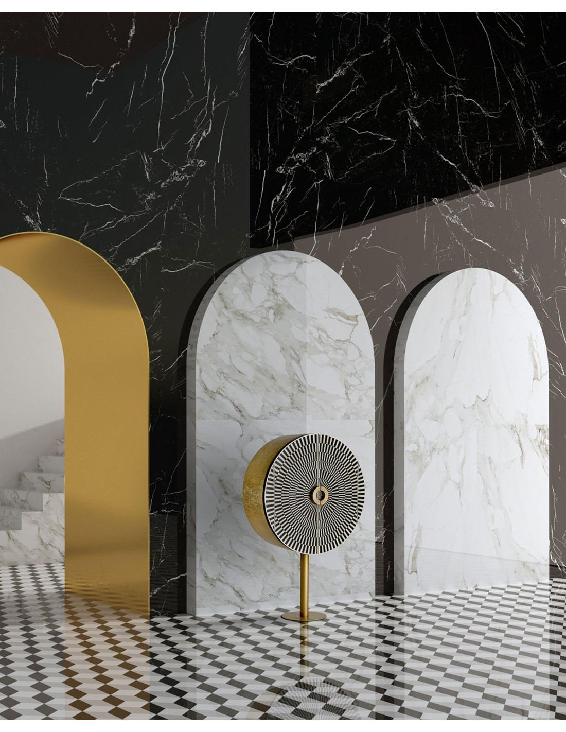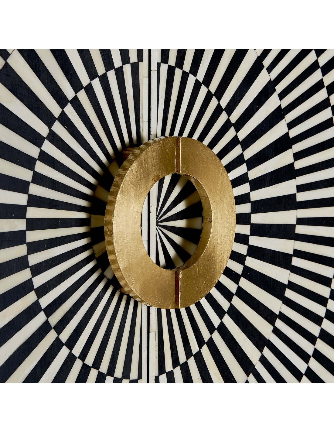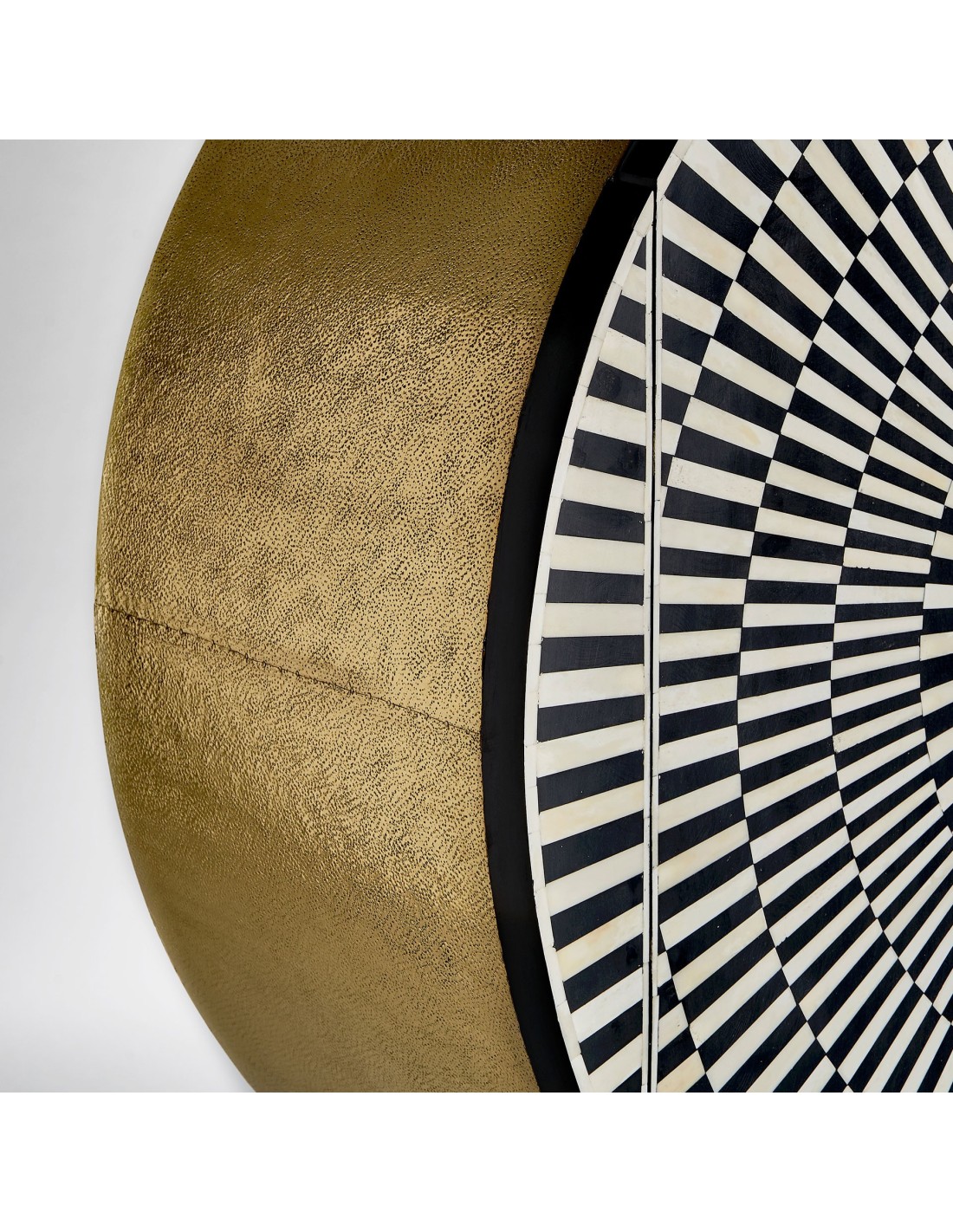 MUEBLE BAR GATSBY, EN COLOR NEGRO/BLANCO/ORO, DE ESTILO ART DECO. FABRICADO EN MADERA DM, COMBINADO CON HIERRO Y HUESO. INTERIOR DE TERCIOPELO. PRODUCTO DESMONTABLE.