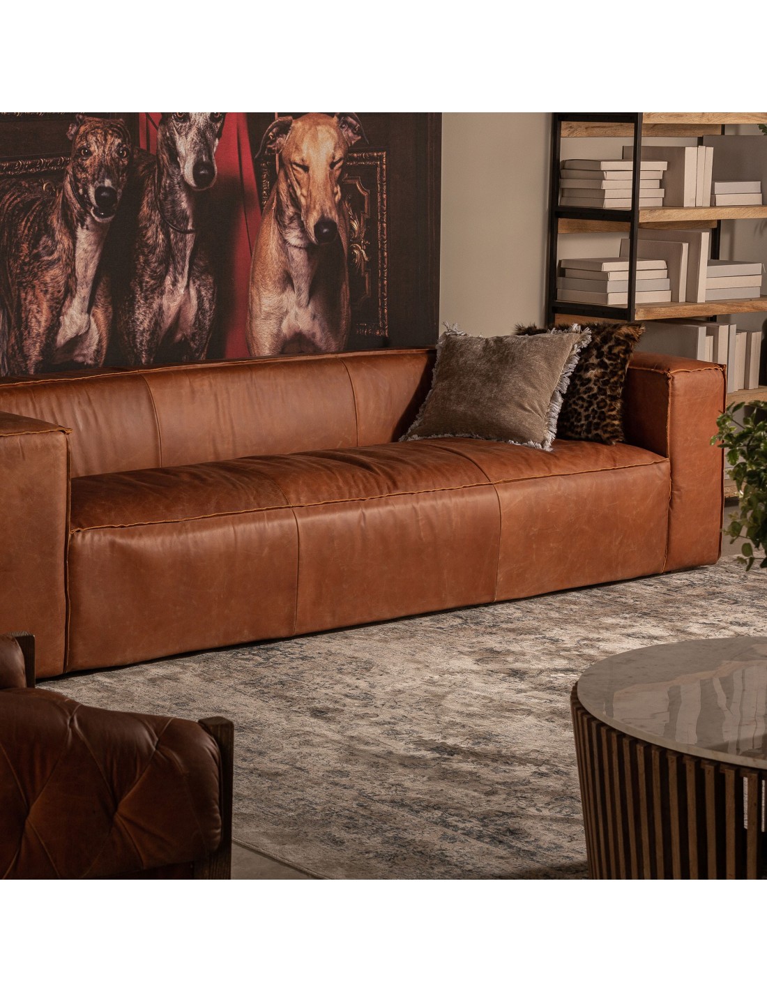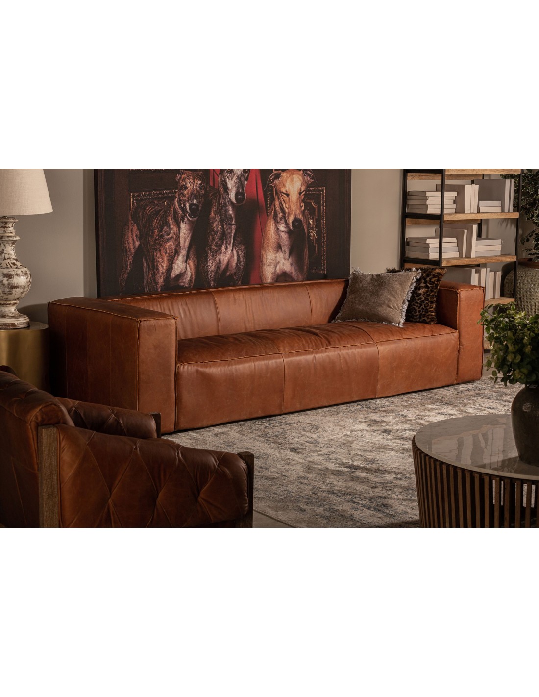 SOFÁ KURZA, EN COLOR MARRÓN, DE ESTILO VINTAGE. FABRICADO EN CUERO VACA, COMBINADO CON MADERA DE ABETO Y ESPUMA. PRODUCTO DESMONTABLE.