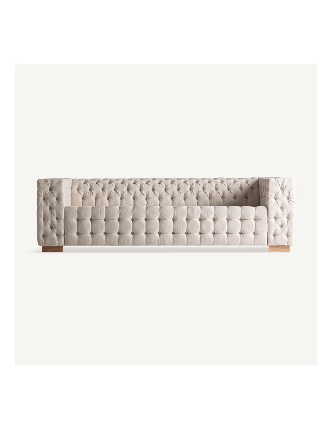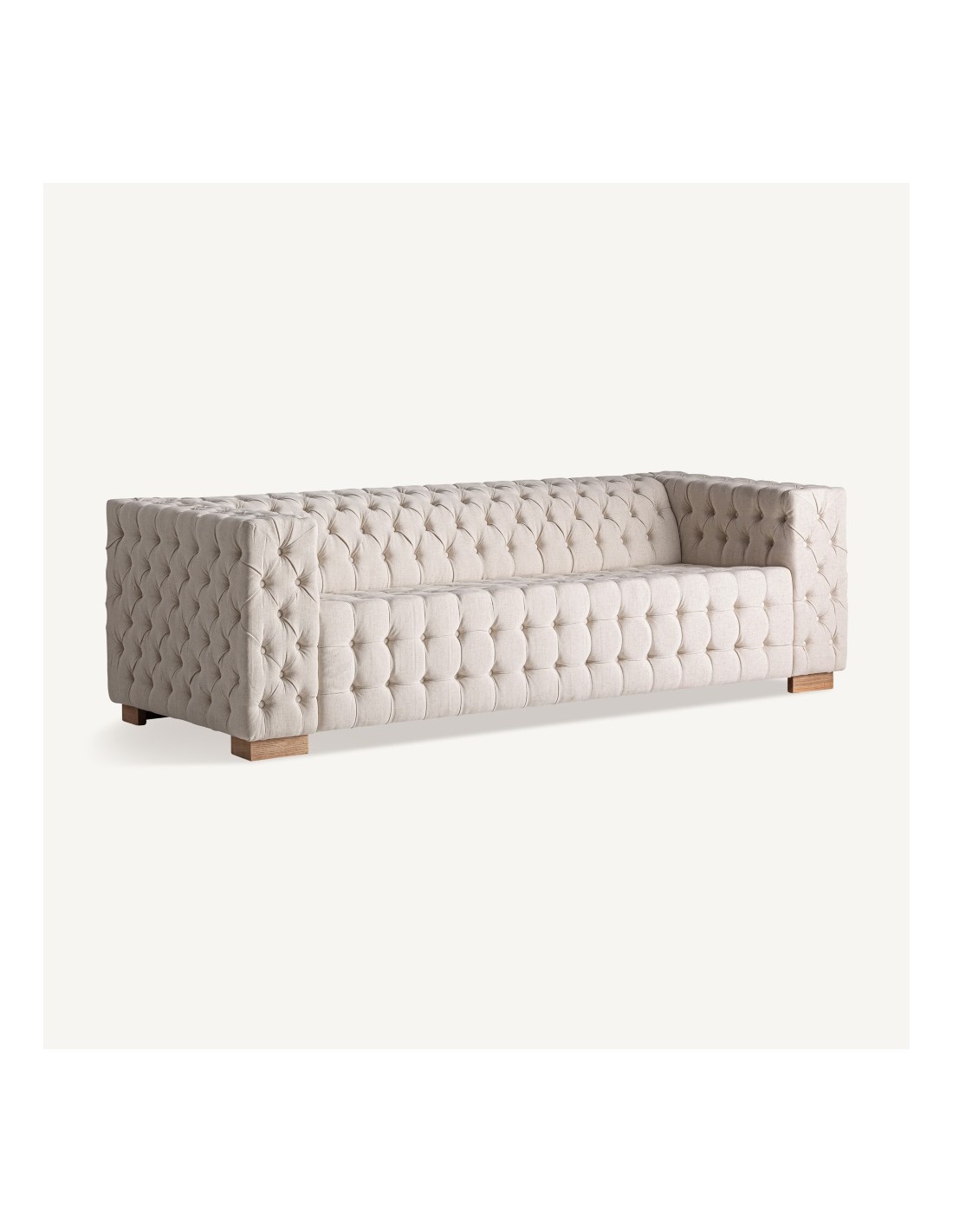 El sofá Genhof de Vical Home destaca por su diseño contemporáneo y elegante. Fabricado en madera de fresno marrón claro y tapizado en terciopelo beige, ofrece amplitud, comodidad y un estilo sofisticado para salones modernos.