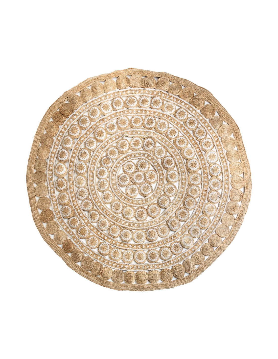 ALFOMBRA REDONDA ZULAI, EN COLOR ARENA, DE ESTILO ÉTNICO. FABRICADO EN CÁÑAMO, COMBINADO CON YUTE.