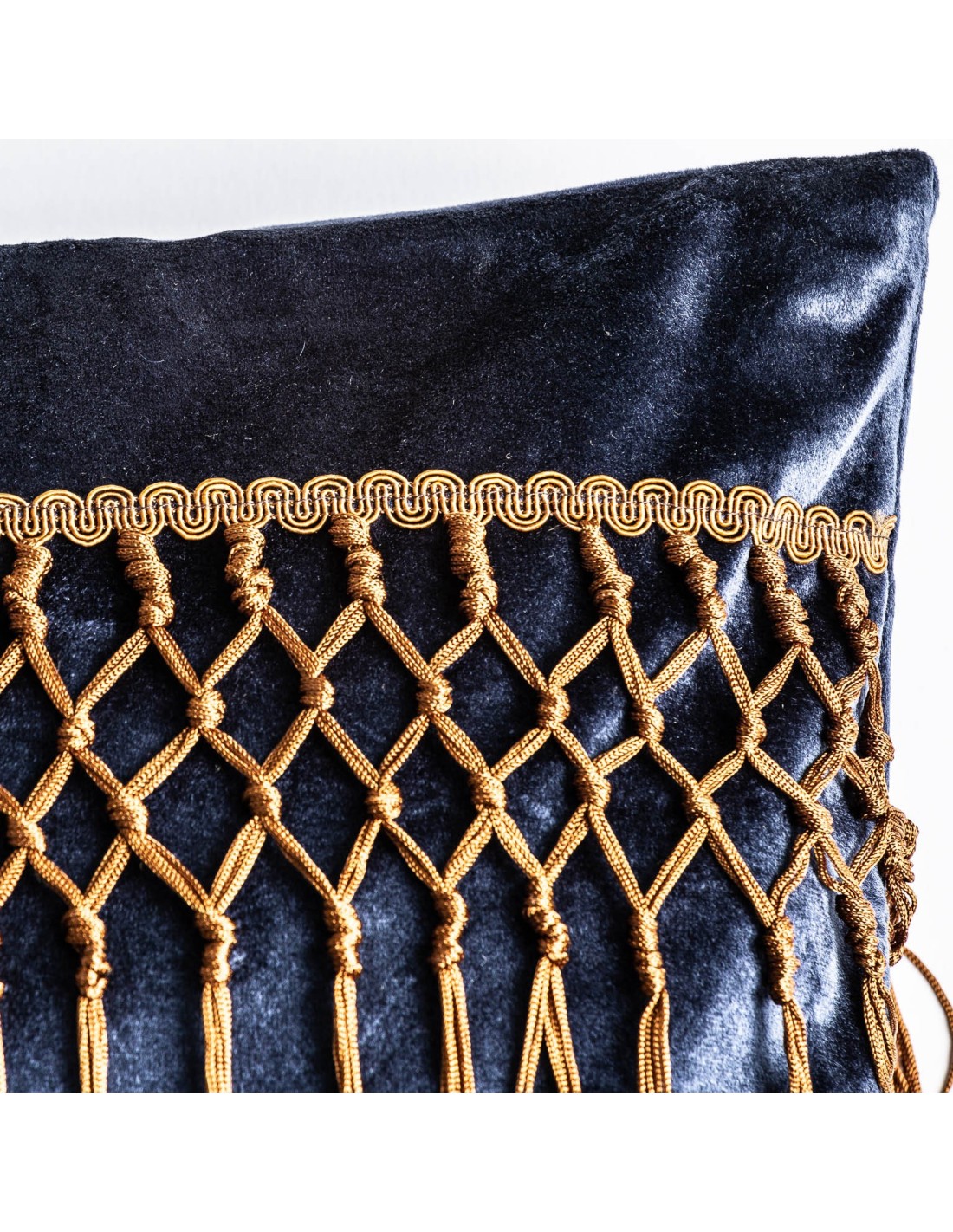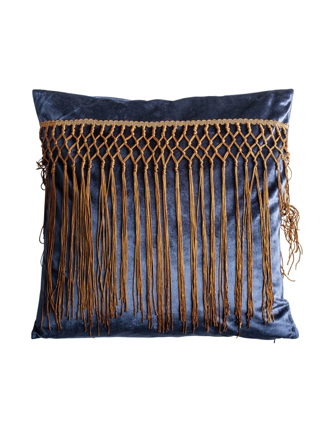 COJÍN DESA, EN COLOR AZUL, DE ESTILO KITSH. FABRICADO EN TERCIOPELO, COMBINADO CON POLIÉSTER Y PLUMAS.
